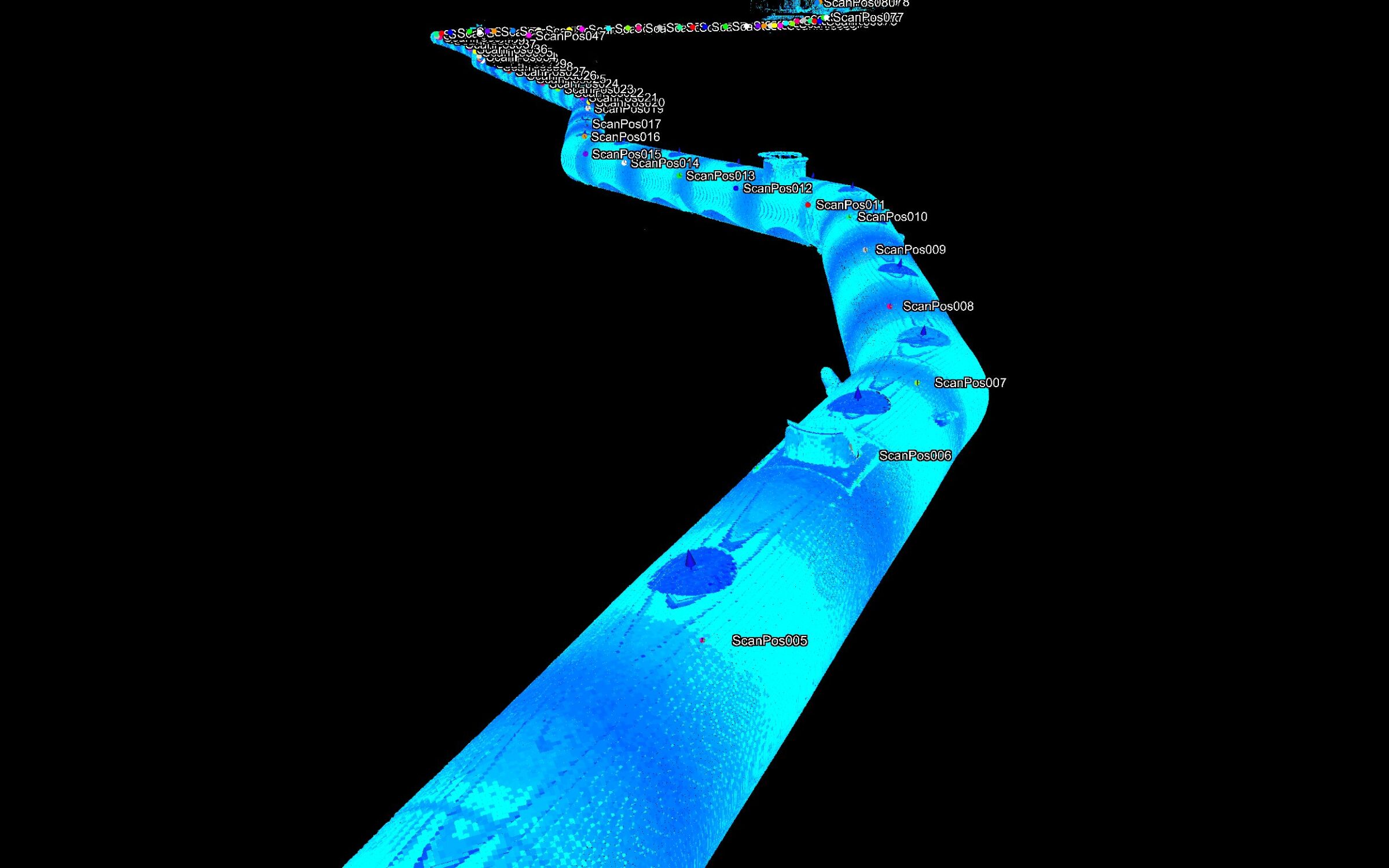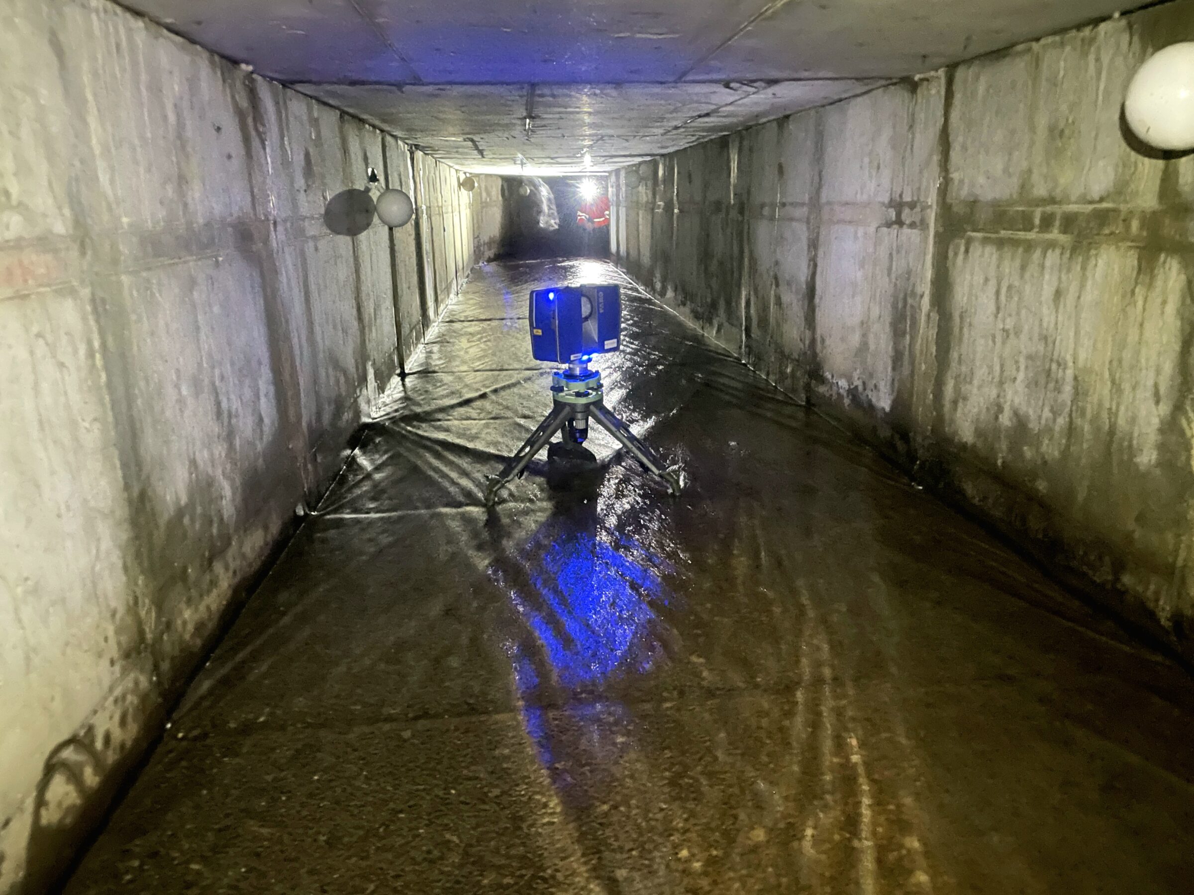 Über zwei Etappen haben wir den Bach mit modernster Technik dokumentiert. Es galt Lage, Verlauf und Abstände exakt zu prüfen und gleichzeitig den Zustand des Durchlaufs festzuhalten. Das bedeutete für unser Team: Rund 500 unterirdische Scan-Positionen für die Vermessung von über 800 m Dorfbach und Wänibach, davon rund 160 m im Rohr. Über diese lange, teils unebene Strecke exakte Messungen vorzunehmen, war eine echte Herausforderung.