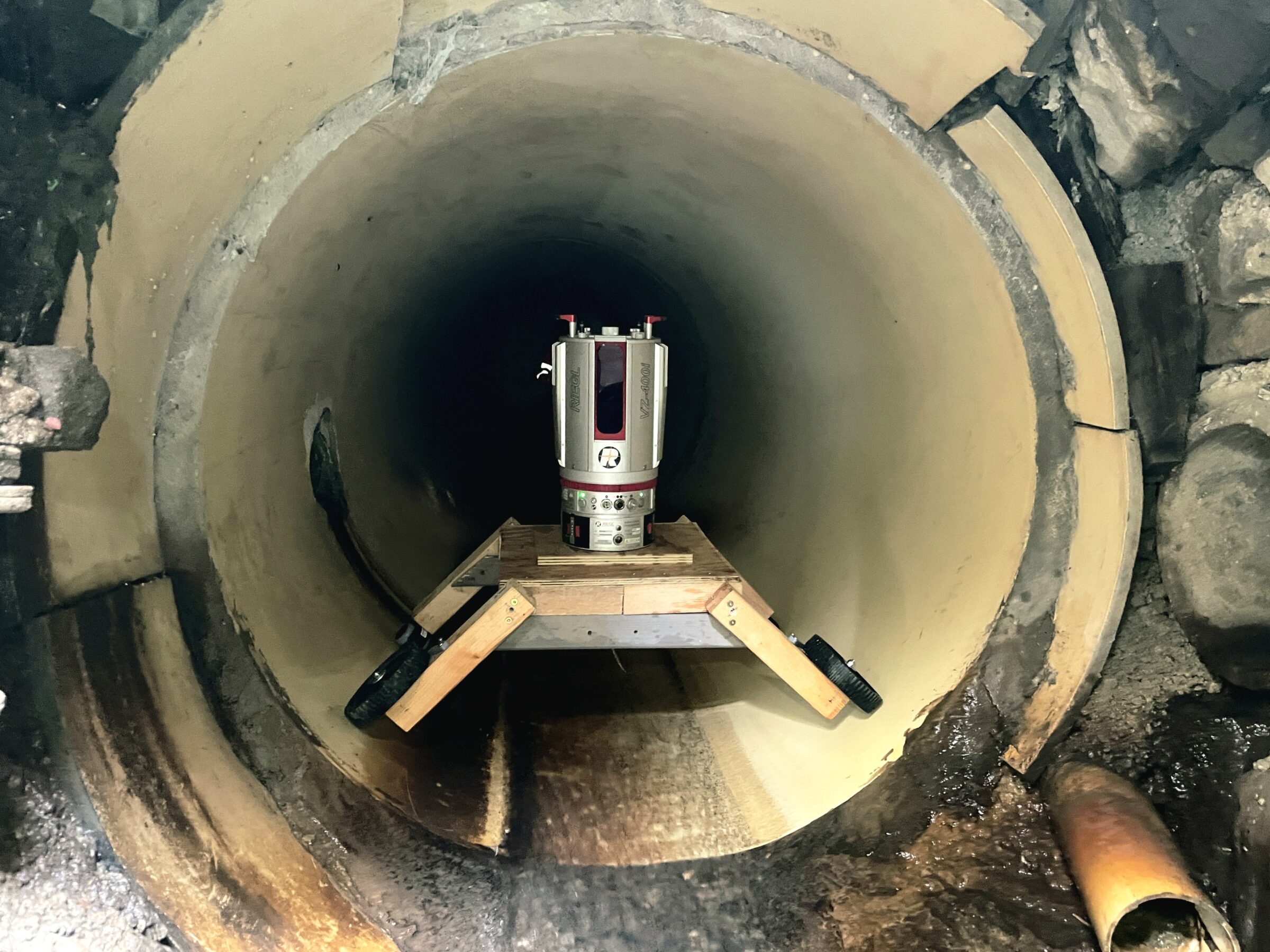 Doch unsere Vermesser erfanden kurzerhand eine kreative Lösung: ein selbstgebautes Wägeli, auf dem Kamera und Laserscanner montiert und von Hand durch die engen Röhren geschoben werden konnten. Das Resultat: Die komplette Vermessung und Dokumentation (inkl. Punktwolke), die Lage und Zustand des Dorfbachs sichtbar macht und eine verlässliche Basis für die sichere Bauplanung des Bezirks Einsiedeln.