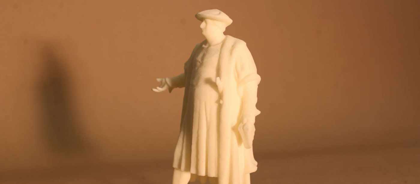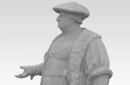 Die Skulptur wurde mittels 3D-Laserscanner erfasst und aus den Aufnahmen ein 3D-Modell erstellt. Diese Daten dienten anschliessend als Grundlage für den 3D-Druck. So entstand schliesslich die ca. 15cm hohe, im Kunststoff-Lasersintering-Verfahren erstellte, Skulptur.