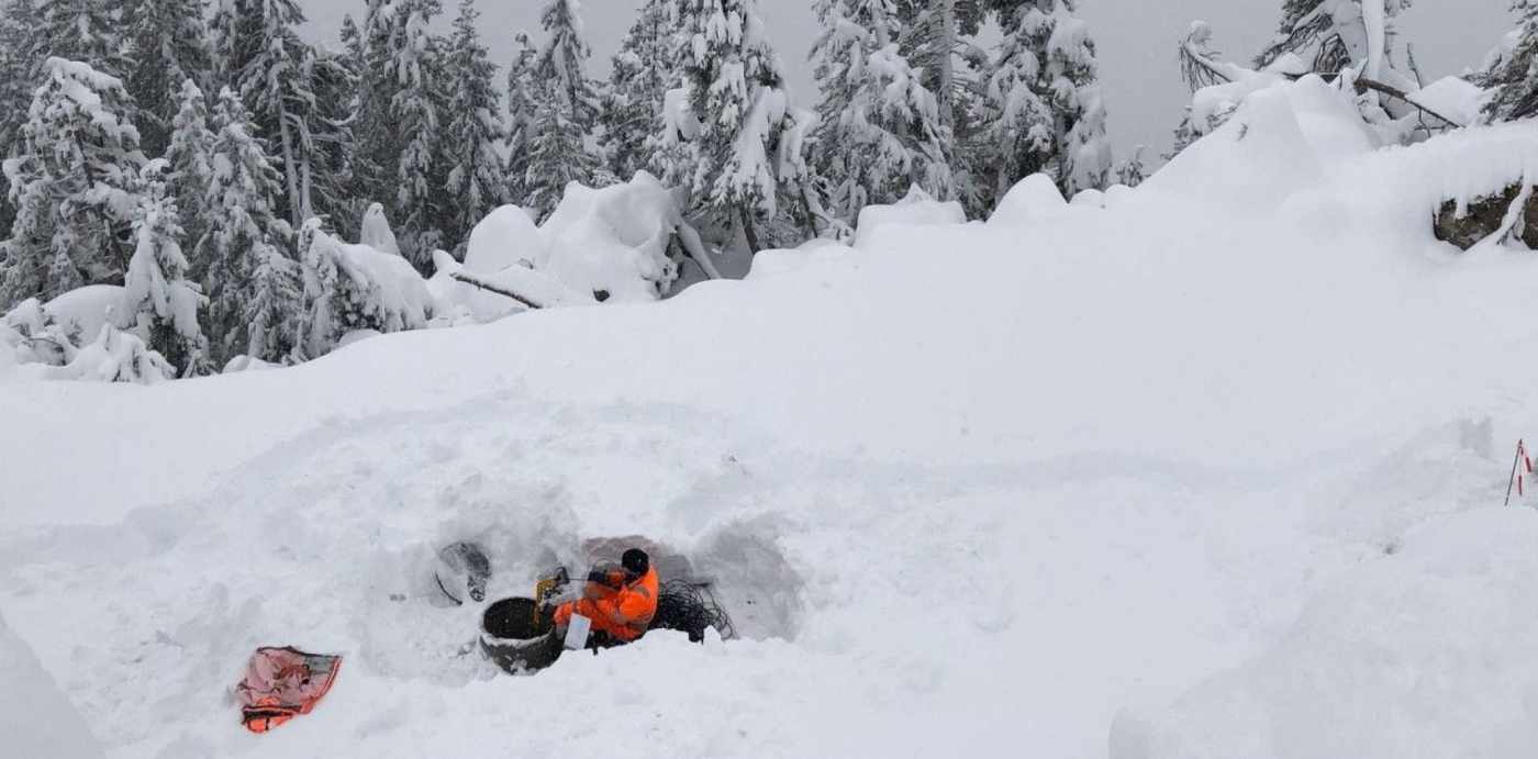 Achtung! Ein Berg bewegt sich, und zwar in einem Monat über 450mm. Unter solchen Umständen können die Spezialisten für die Messung der Fels-Bewegungen nicht bis zum Frühling warten. Rauf mit dem Heli und ab in den Schnee! Die Messstellen lagen unter einem Meter Schnee begraben und mussten zuerst ausgebuddelt werden.